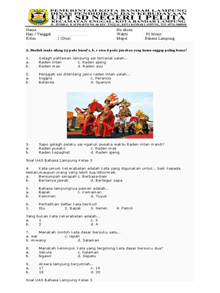 Berikut adalah beberapa contoh soal bahasa Lampung kelas 3 SD semester 1 beserta pembahasannya: